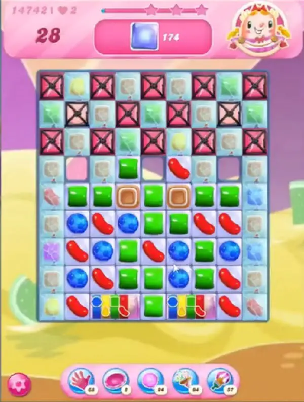 This level has medium difficulty. For this level try to play from bottom to shuffle the candies as it will help to get more special candy. Play with wrapped candy and use more striped candy to break the corner frosting blockers.