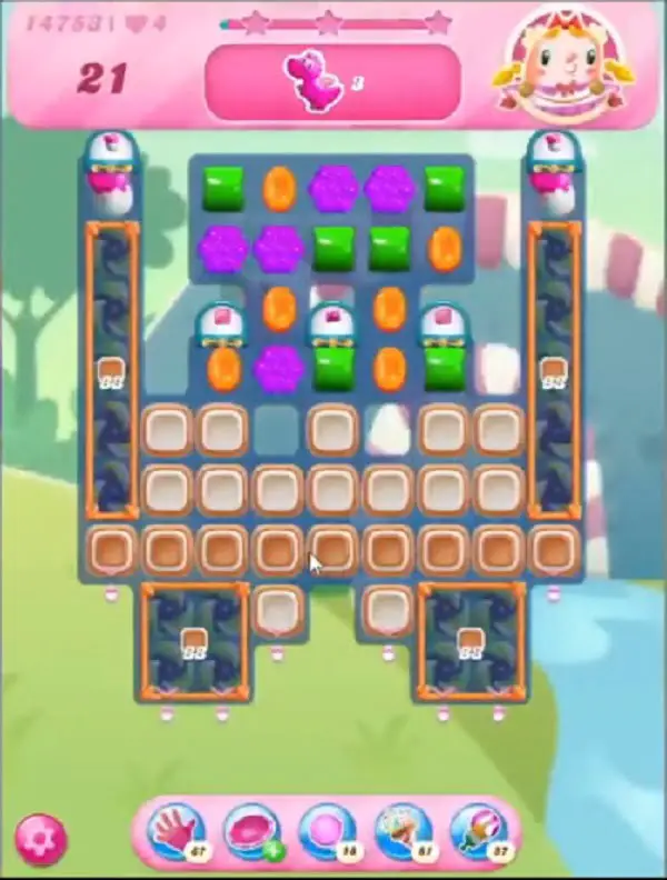 This level has medium difficulty. For this level try to play near to blockers and from bottom to shuffle the candies. Use more striped candy or play near to ingredients to move them and take them out from the board.