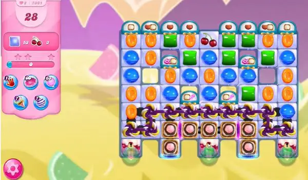 This level has hard difficulty. For this level try to play near to blockers or from where more candies are available to play. Use more striped candy or play near to ingredients to move them and take them out from the board within 28 moves.
